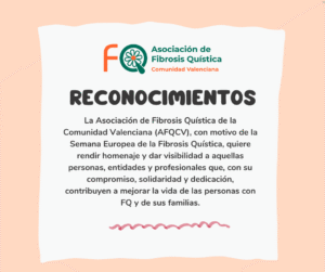 La Asociación de Fibrosis Quística de la Comunidad Valenciana (AFQCV), con motivo de la Semana Europea de la Fibrosis Quística, (17 a 23 de noviembre), quiere rendir homenaje y dar visibilidad a todas aquellas personas, entidades y profesionales que, con su compromiso, solidaridad y dedicación, contribuyen cada día a mejorar la vida de las personas con Fibrosis Quística y de sus familias.